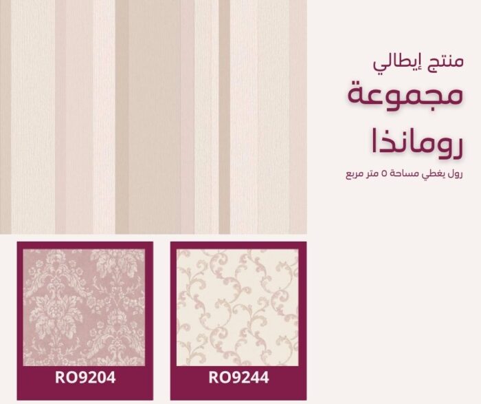 ورق جدران إيطالي رومانذا 9254 هو منتج فاخر بتصميم مقلم رائع يضفي لمسة كلاسيكية أنيقة على أي مكان يُثبت فيه. يأتي بألوان متنوعة تتضمن السكري والبيج، الفضي والرصاصي، والوردي والزهري والروز.